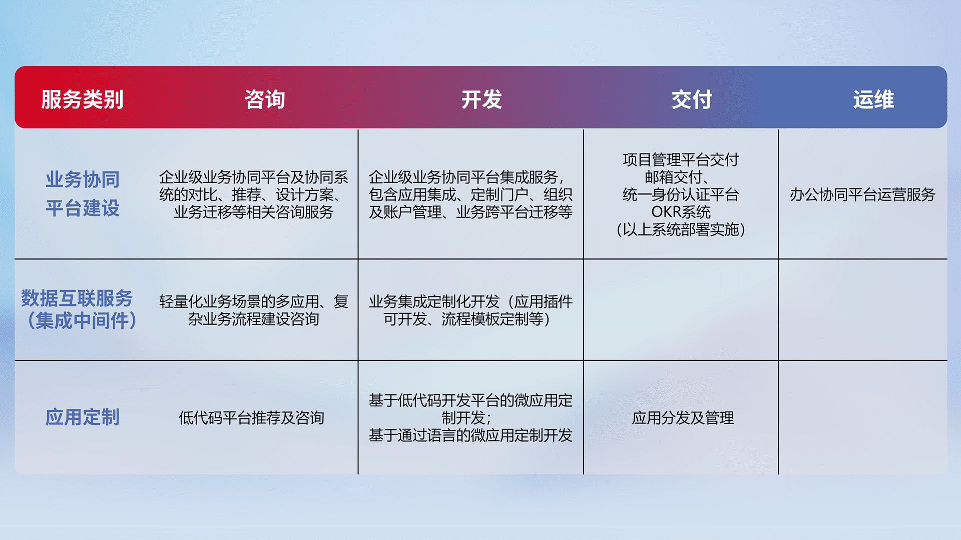 针对钉钉、、、、企微、、IDaas等平台级产品提供产品的规划、、方案、、、、交付、、、、定制化开发等服务,,,实现如统一协同办公、、、智能客户服务、、混合会议管理、、、智能数据查询、、、等业务场景,,实现数字化转型。。。。